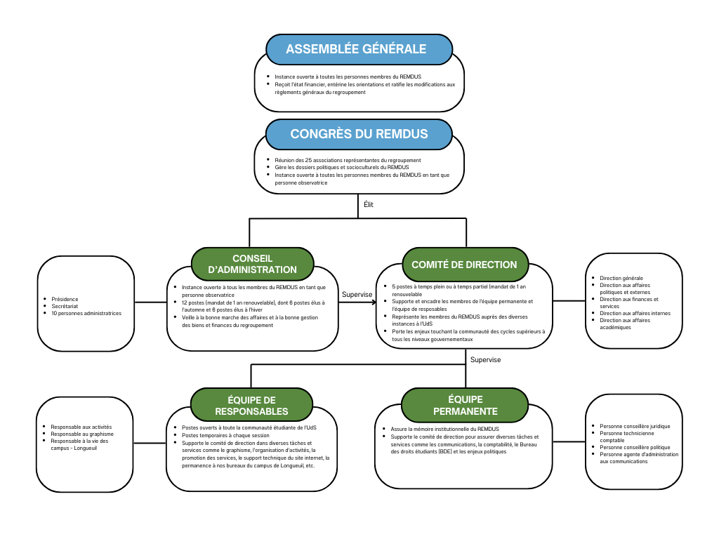 La Direction générale est un pilier au sein de l’équipe du REMDUS. Elle assure la coordination, le support et l’encadrement de l’équipe du REMDUS, dont les personnes employées. La Direction générale assure également la convocation, la logistique et le bon déroulement des instances du REMDUS : l’assemblée générale, le conseil d’administration, le congrès et le comité de direction.